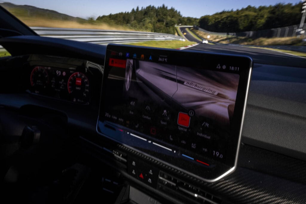 Prislonim kartico in zapornica se odpre. Avtomatski menjalnik z gumbom prestavim v ročni program in pohodim plin. 300 konjičev zaživi in skupaj zdrvimo po štartni ravnini v 20-kilometrsko nirvano. Avto v ovinkih ostaja nevtralen in prilepljen na dirkaški asfalt, zahvaljujoč izboljšanim zavoram ga niti dirkaško močno zaviranje ne zmede. Ob prestavljanju navzdol in močnem zaviranju ostaja nevtralen in brezhibno sledi liniji, ki mu jo z volanom določi adrenalina poln voznik. Odlično! Kar me pri vsem skupaj najbolj navdušuje, je dejstvo, da je ob spremembi programa motorne elektronike avto z dvema potnikoma brez težav in bolečin za hrbtenico še vedno prebavil tudi skoraj tri tisoč odpeljanih kilometrov v dveh delovno dirkaških dneh do Nürburginga in nazaj. In jasno, še dobrih 80 kilometrov po “Zelenem peklu”. Zahvaliti se moram odličnim in precej dirkaško oblikovanim prednjim sedežem, ki v črno-sivi barvni kombinaciji in z drobnimi rdečimi vložki ob armaturni letvi iz vidnih ogljikovih vlaken pričarajo v Golfu GTI Clubsport zares eleganten, a še vedno dovolj športen občutek notranjosti vozila.
